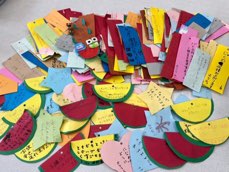 作業に来てくださった保護者の方々と、すいか型や星型など、色んな形の短冊を作りました。今年は竹を校内1階、昇降口に飾る予定で、去年より本数を減らして3本なので、短冊自体が飾りになるよう工夫しました。すいか、大量生産ですw。